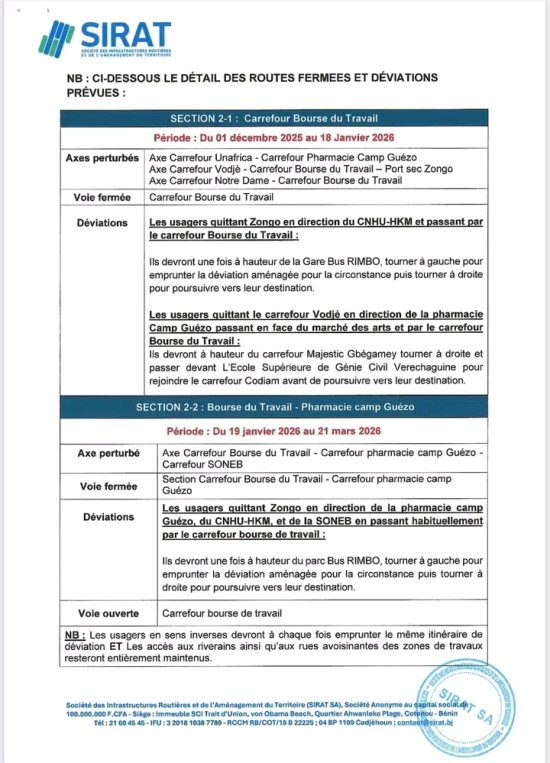 – Du lundi 19 Janvier 2026 au dimanche 15 Mars 2026 : fermeture de la section comprise entre le carrefour bourse du travail et le carrefour de la pharmacie Camp Guézo dans les deux sens.