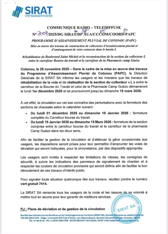 La Direction Générale de la SIRAT SA informe les usagers et les riverains que les travaux de réhabilitation de la voie et de réalisation de la section du collecteur « L » entre le carrefour de la Bourse du Travail et celui de la Pharmacie Camp Guézo démarreront le lundi 1er décembre 2025 et se poursuivront jusqu’au dimanche 15 mars 2026. C’est dans le cadre de la mise en œuvre des travaux du Programme d’Assainissement Pluvial de Cotonou (PAPC).