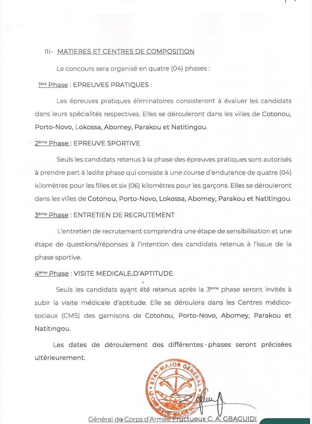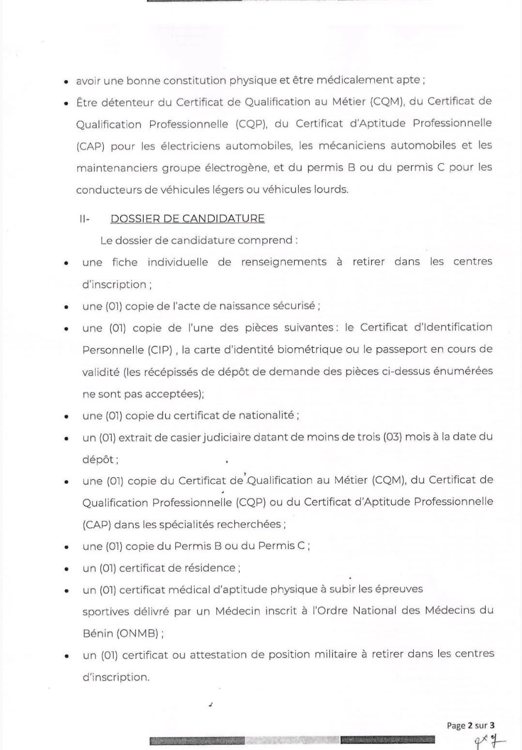 Dans le cadre du renforcement des effectifs des Forces armées béninoises (Fab), il sera organisé un concours de recrutement sur titre de 100 personnes spécialistes au titre de l’année 2026. L’annonce a été faite par le Chef d’Etat-major des Forces armées béninoises, à travers un communiqué radio en date du 15 janvier 2026. Selon ce communiqué, 40 mécaniciens automobiles ; 40 conducteurs de véhicules légers et de véhicules lourds ; 10 électriciens automobiles ; et 10 maintenanciers de groupe électrogène et d’installation solaire, seront recrutés.