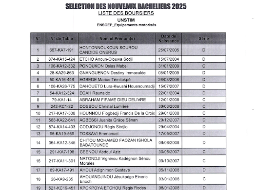 Liste des nouveaux bacheliers bénéficiaires de bourses pleines à l’Université nationale des Sciences, technologies, ingénierie, et mathématiques (UNSTIM) au titre de l’année académique 2025-2026.