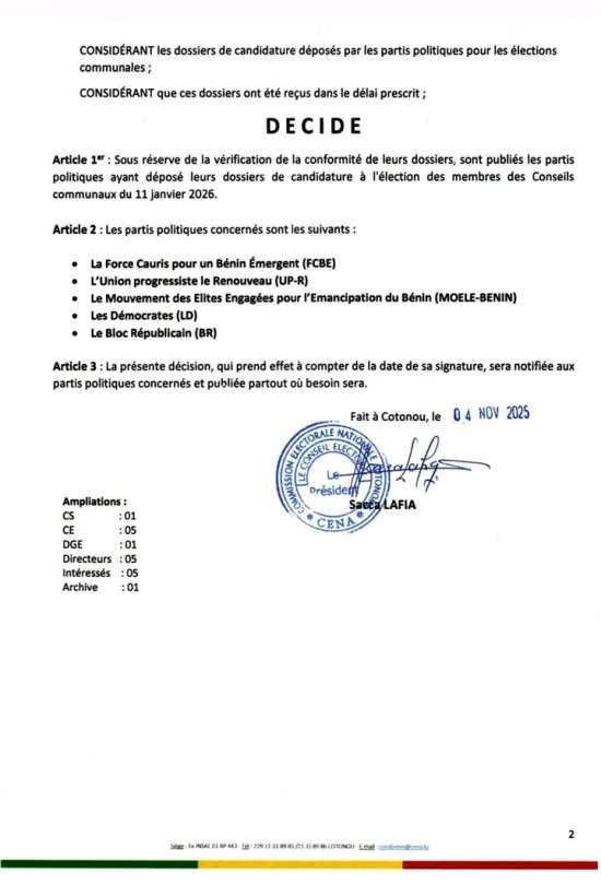 Par décision en date du 4 novembre 2025, le président de la CENA a publié la liste des partis politiques déclarés pour les élections communales du 11 janvier 2026.