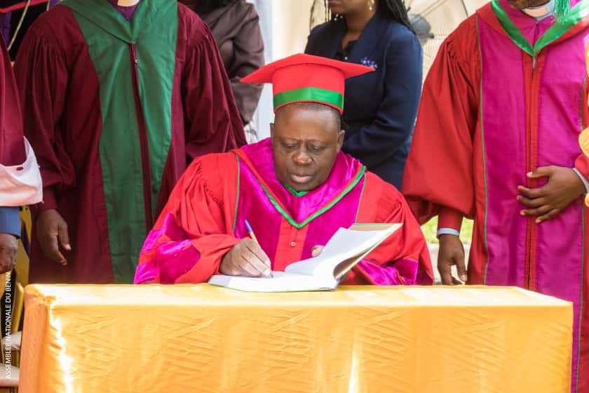 Aux côtés du nouveau Docteur pour cette cérémonie de remise de titre, figuraient en première loge : M. Victor Dassi ADOSSOU, président de la Cour suprême, Mme Ismath BIO TCHANE MAMADOU, présidente de la Cour des comptes, M. Pascal ESSOU, Médiateur de la République, M. Edouard LOKO, président de la Haute Autorité de l’Audiovisuel et de la Communication (HAAC), l’honorable David Godonou HOUINSA, Deuxième secrétaire parlementaire, M. Charlemagne YANKOTY et M. Franck OKPEITCHA, respectivement maire de Porto-Novo et maire d’Ifangni.