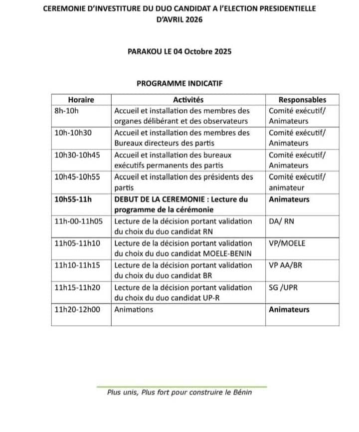 Voici le programme officiel de la cérémonie d’investiture de Romuald Wadagni-Mariam Talata, duo candidat de la mouvance à l’élection présidentielle 2026.