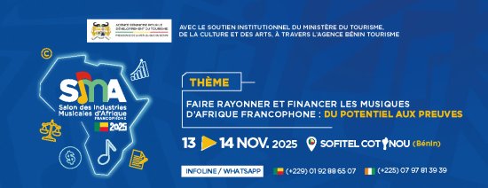 Le Sofitel Cotonou Marina Hôtel accueille du 13 au 14 novembre 2025, le Salon des Industries Musicales d’Afrique Francophone (SIMA 2025). Ce grand rendez-vous est organisé avec le soutien du ministère du Tourisme, de la Culture et des Arts à travers l’Agence Bénin Tourisme et plusieurs autres partenaires. « Faire rayonner et financer les musiques d’Afrique Francophone : du Potentiel aux preuves », c’est le thème de l’édition 2025 du Salon des Industries Musicales d’Afrique Francophone. (…)