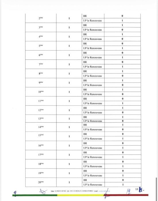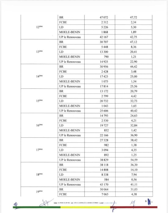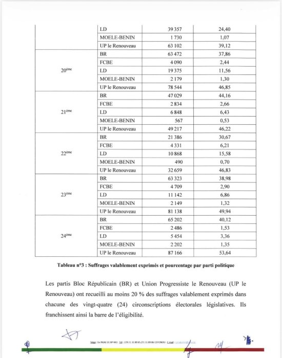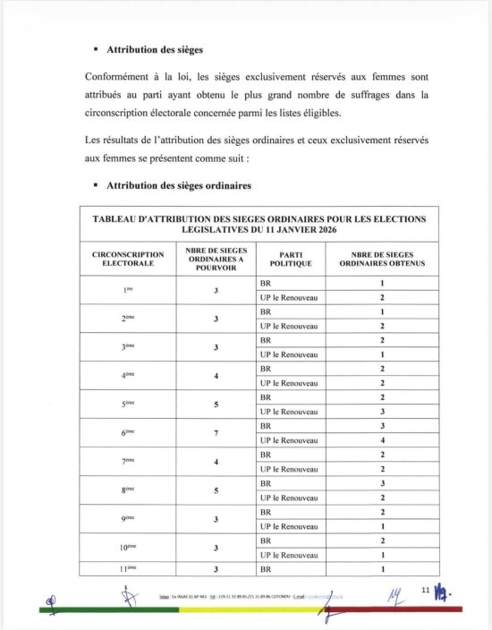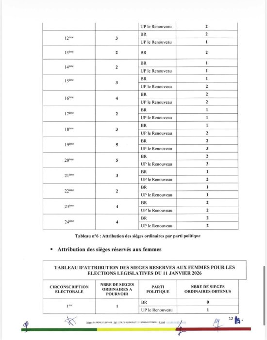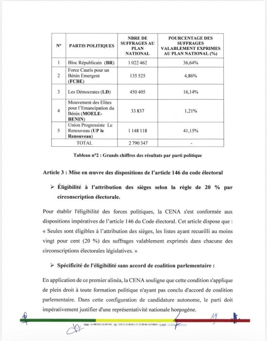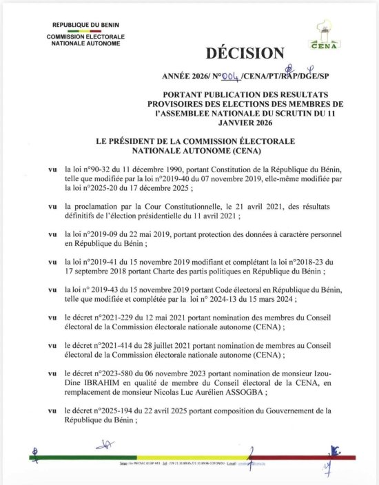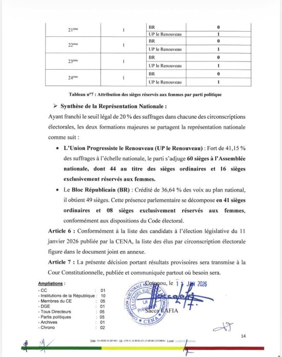 Les partis de la mouvance présidentielle BR et UP-R sont les seuls partis ayant franchi le seuil légal de 20% des suffrages dans chacune des circonscriptions électorales. Voici l’intégralité de la décision de la CENA.
