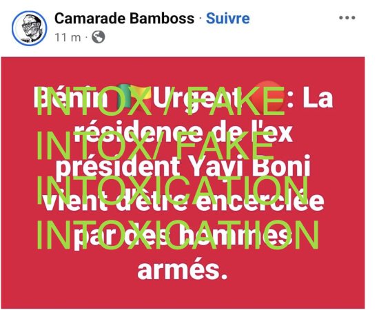 Après l’échec de la mutinerie du 7 décembre 2025, le Bénin continue de faire l’objet d’agressions massives. Cette fois c’est via les réseaux sociaux que la bataille fait rage dans l’optique d’amener les paisibles populations à une insurrection généralisée. La dernière publication qui corrobore cette thèse vient de la page facebook dénommé Camarade Bamboss ou sans vergogne , on pouvait lire :Urgent Bénin : La résidence de l’ex président de Boni Yayi vient d’être encerclée par des hommes armés