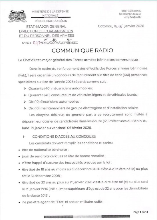 Dans le cadre du renforcement des effectifs des Forces armées béninoises (Fab), il sera organisé un concours de recrutement sur titre de 100 personnes spécialistes au titre de l’année 2026. L’annonce a été faite par le Chef d’Etat-major des Forces armées béninoises, à travers un communiqué radio en date du 15 janvier 2026. Selon ce communiqué, 40 mécaniciens automobiles ; 40 conducteurs de véhicules légers et de véhicules lourds ; 10 électriciens automobiles ; et 10 maintenanciers de groupe électrogène et d’installation solaire, seront recrutés.