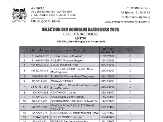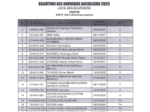 Liste des nouveaux bacheliers bénéficiaires de bourses pleines à l’Université nationale des Sciences, technologies, ingénierie, et mathématiques (UNSTIM) au titre de l’année académique 2025-2026.