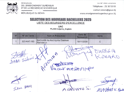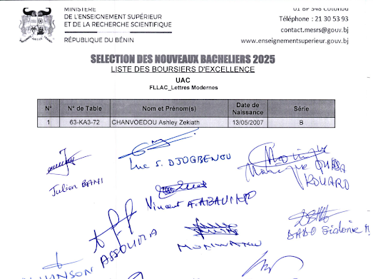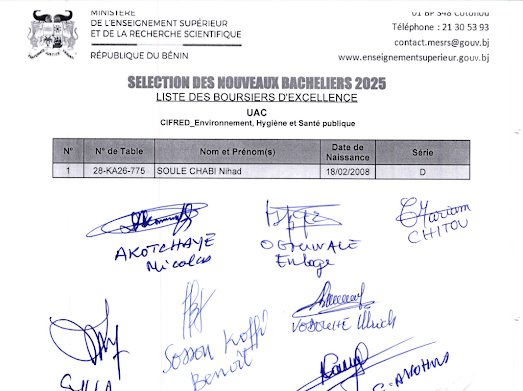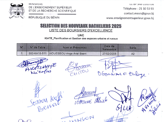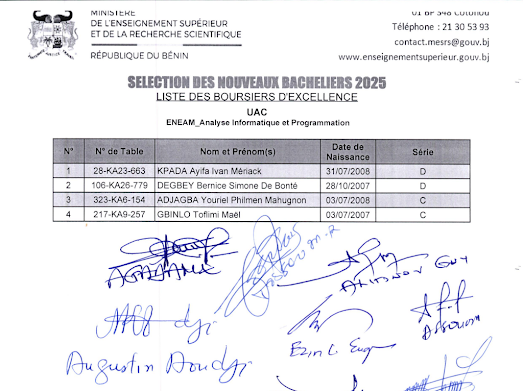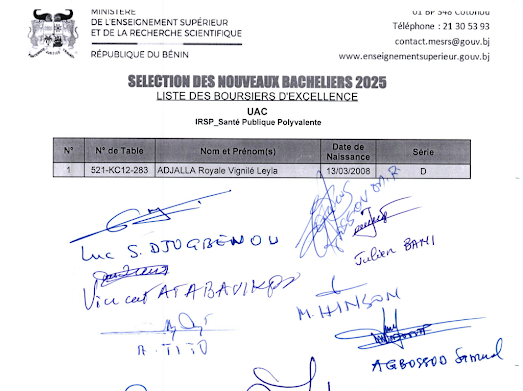 Le ministère de l’enseignement supérieur et de la recherche scientifique a publié la liste des bacheliers bénéficiaires de bourses d’excellence dans les écoles et facultés à l’Université d’Abomey-Calavi (UAC).