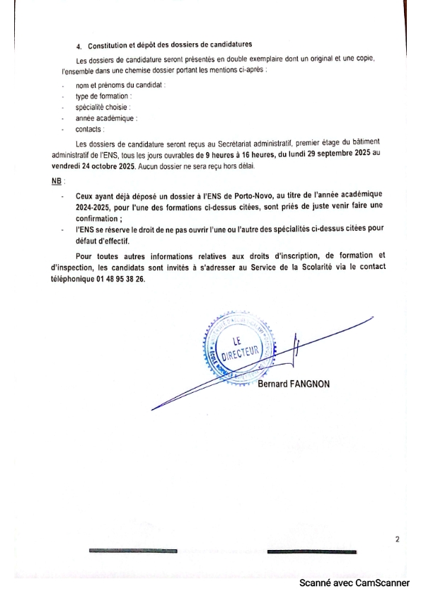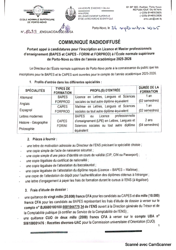 L’Ecole Normale Supérieure (ENS) de Porto-Novo, a ouvert, du 29 septembre au 24 octobre 2025, les inscriptions en Licence et Master professionnels d’enseignement (BAPES et CAPES) au titre de l’année académique 2025-2026. Lire l’appel à candidatures...