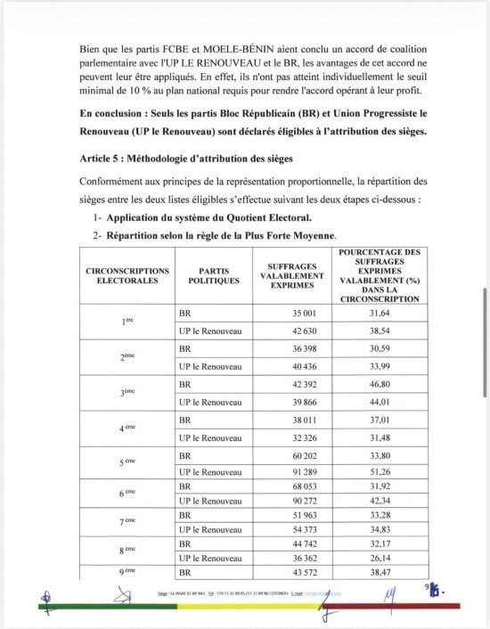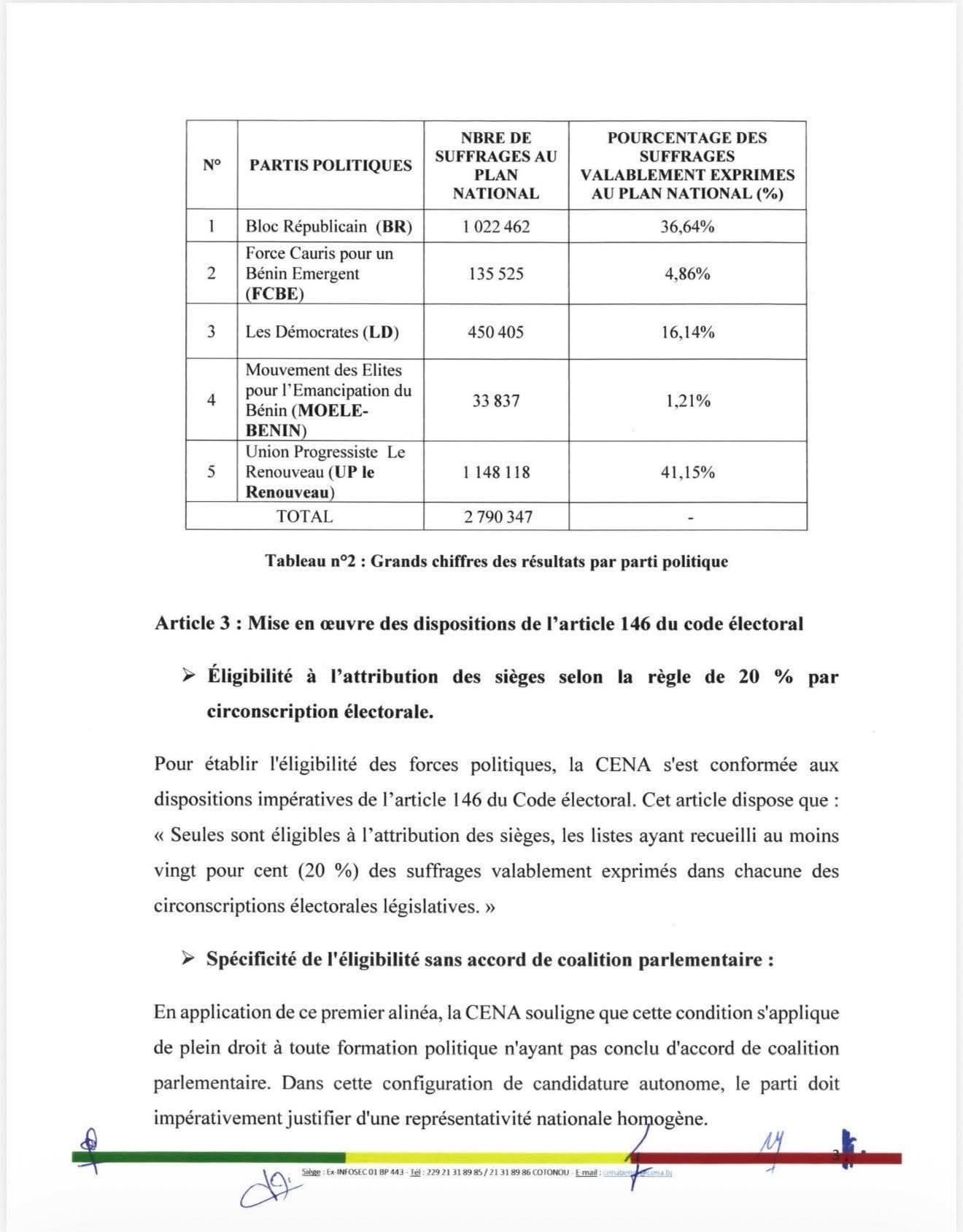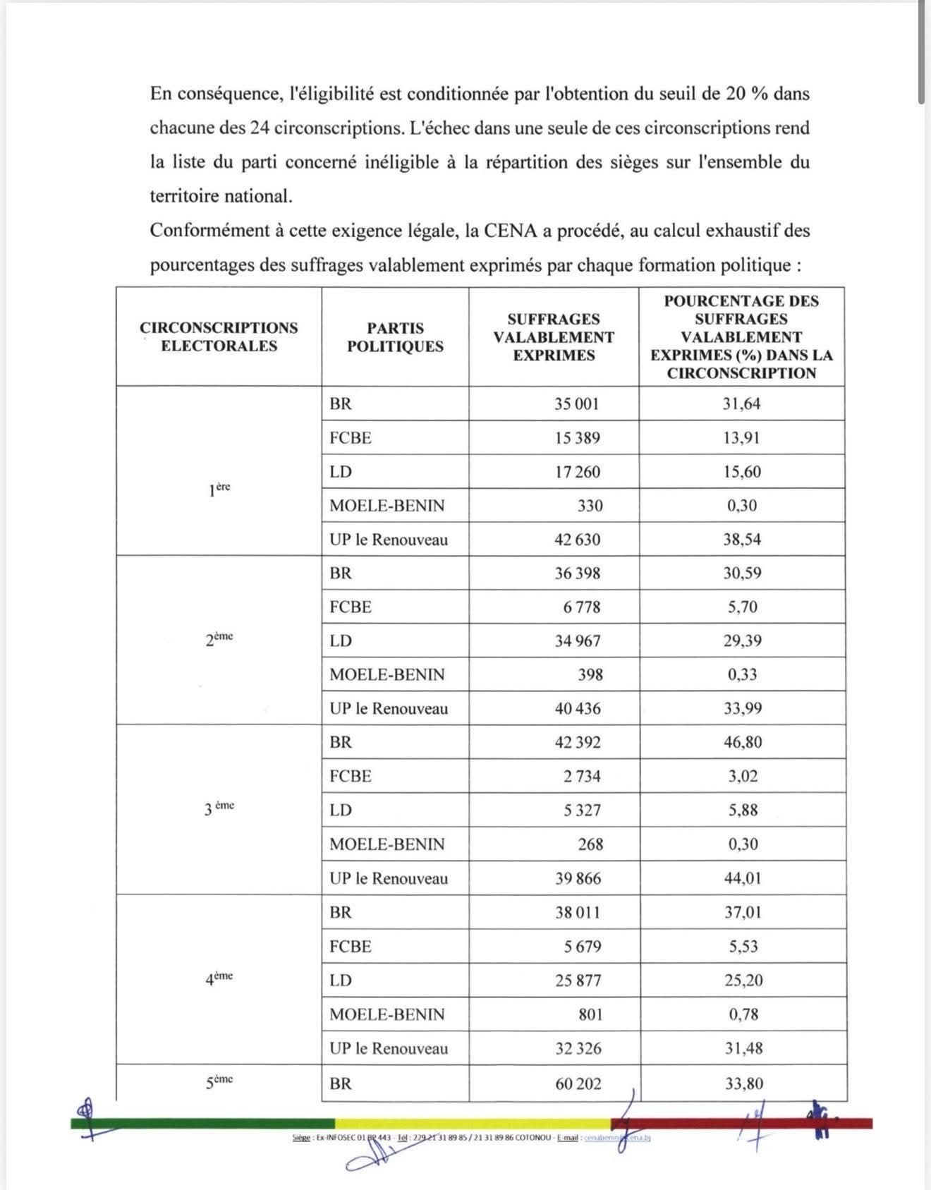 Les partis de la mouvance présidentielle BR et UP-R sont les seuls partis ayant franchi le seuil légal de 20% des suffrages dans chacune des circonscriptions électorales. Voici l’intégralité de la décision de la CENA.