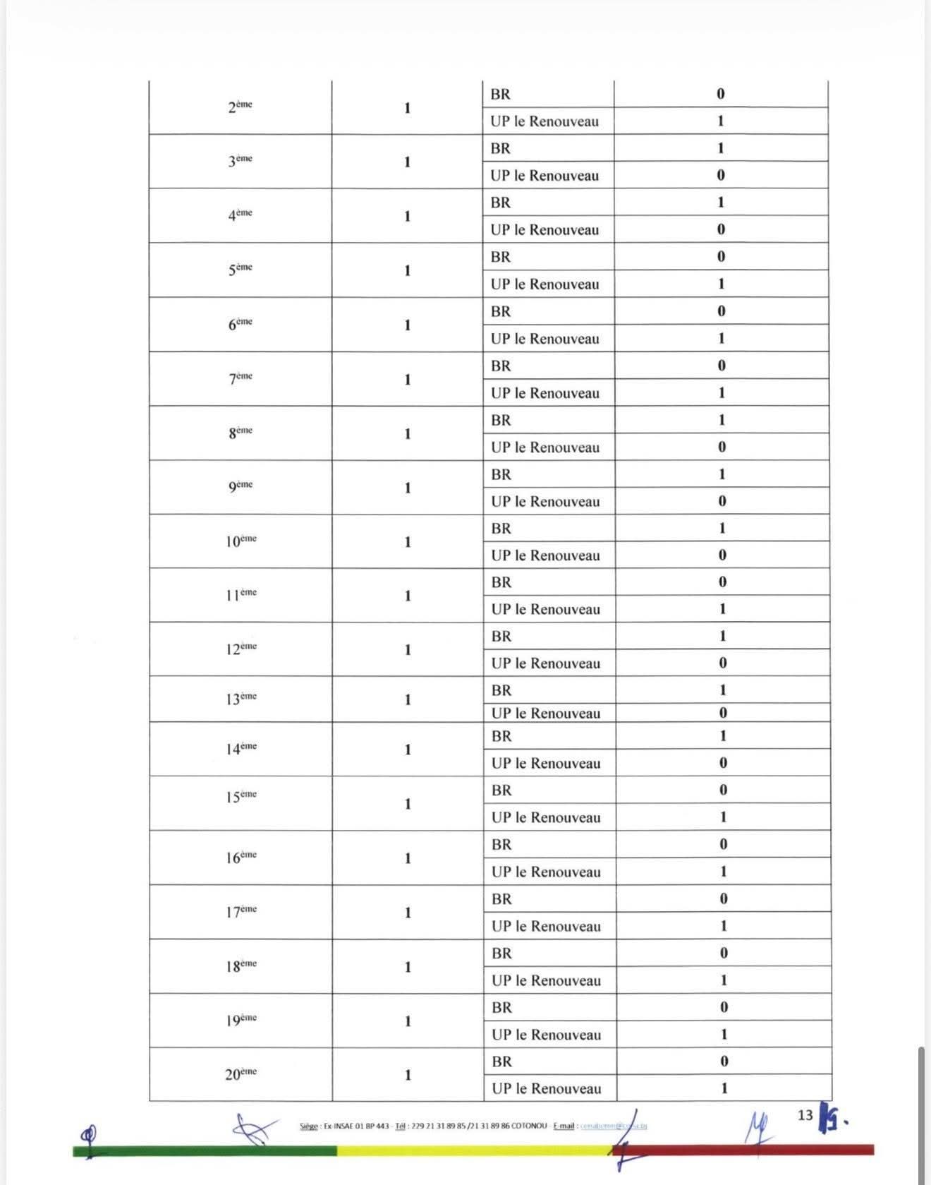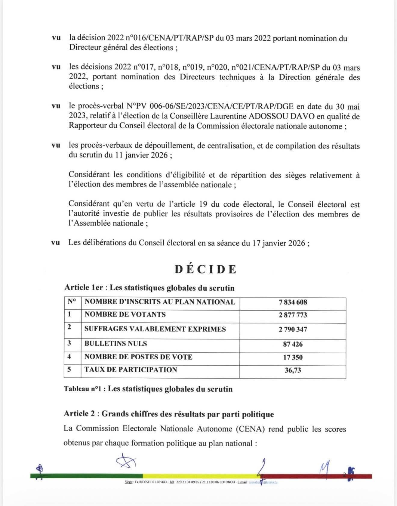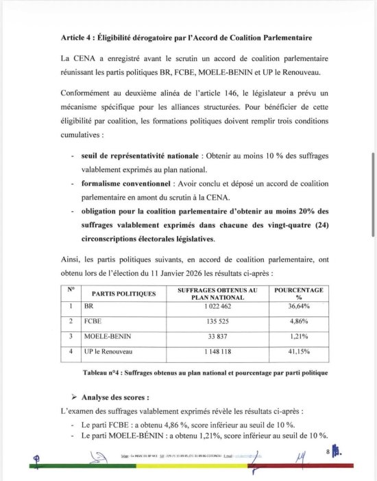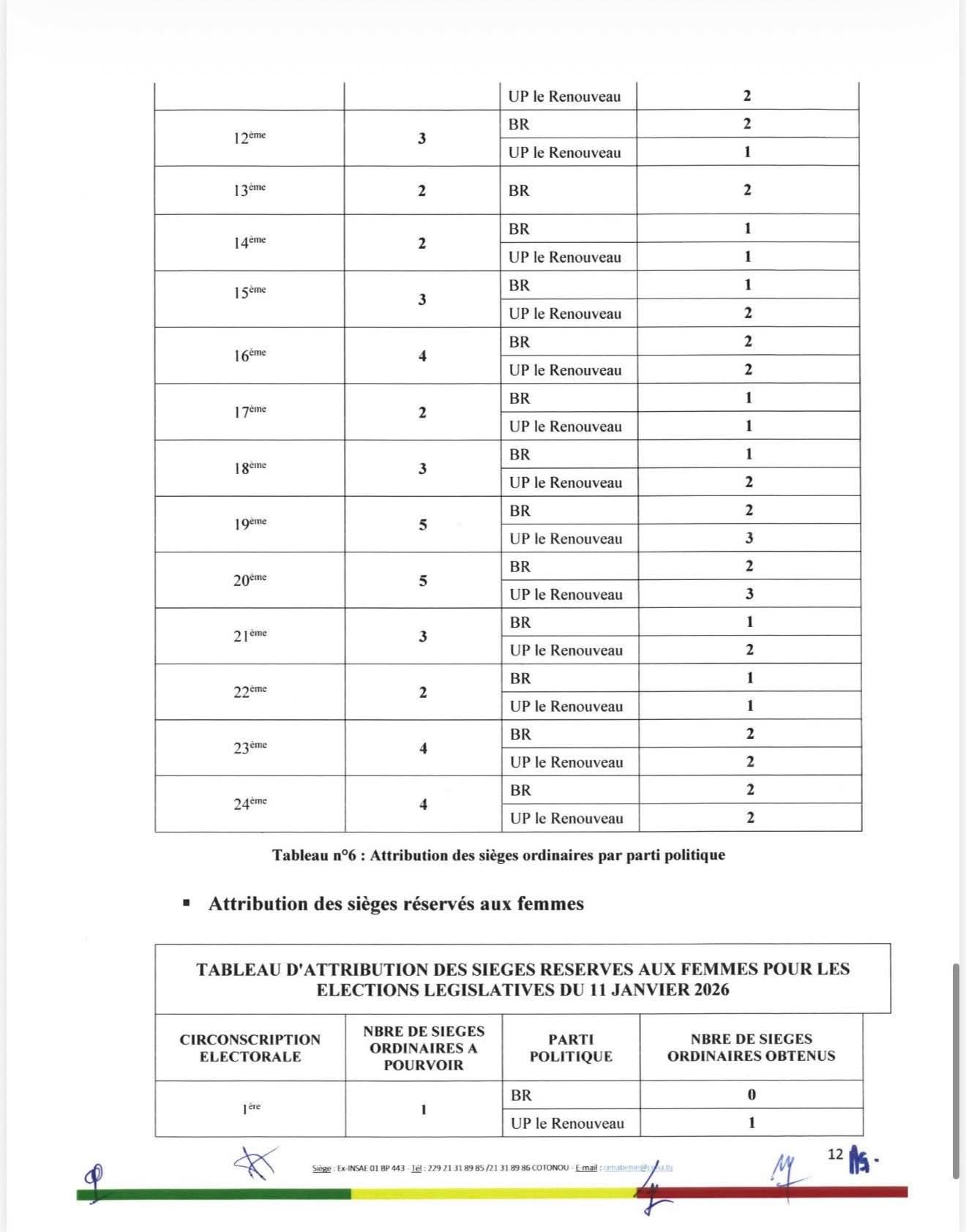 Les partis de la mouvance présidentielle BR et UP-R sont les seuls partis ayant franchi le seuil légal de 20% des suffrages dans chacune des circonscriptions électorales. Voici l’intégralité de la décision de la CENA.