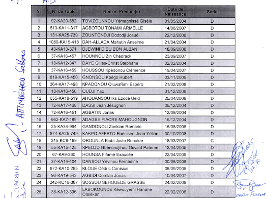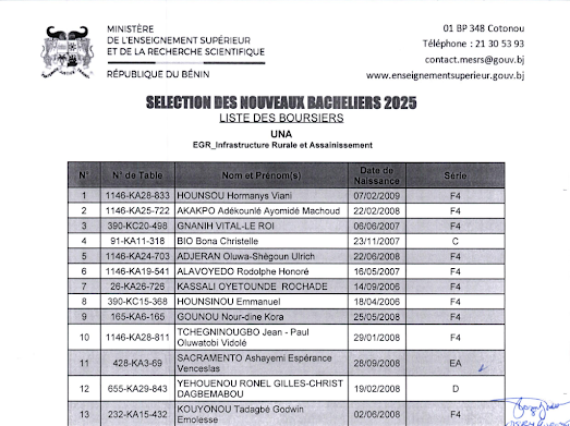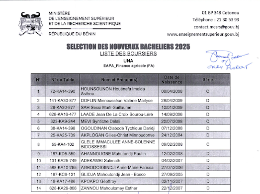 Liste des nouveaux bacheliers bénéficiaires de bourses pleines à l’Université nationale d’agriculture (UNA), au titre de l’année académique 2025-2026.
