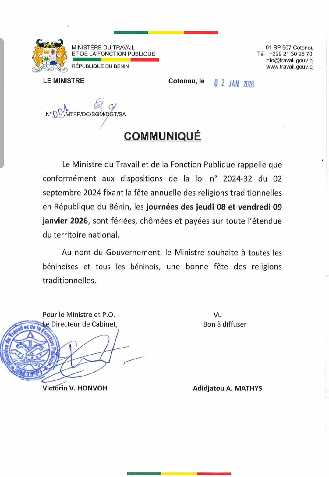 Bonne nouvelle pour les travailleurs béninois. Ils n’iront pas au boulot les jeudi 8 et du vendredi 9 janvier 2026, déclarés fériés, chômés et payés sur toute l’étendue du territoire national par le gouvernement. Et ce, conformément aux dispositions de la loi n° 2024-32 du 02 septembre 2024 fixant la fête annuelle des religions traditionnelles en République du Bénin. L’annonce a été faite par Adidjatou Mathys, ministre du travail et de la fonction publique.