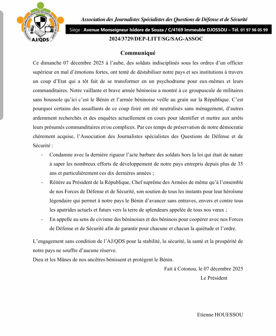 L’Association des journalistes spécialistes des questions de défense et de sécurité a déploré la tentative de coup d’Etat perpétré par un groupe de militaires contre le Bénin le dimanche 07 décembre 2025. A travers un communiqué, elle a exprimé son soutien au chef de l’Etat Patrice Talon et à l’ensemble des Forces de défense et de sécurité.