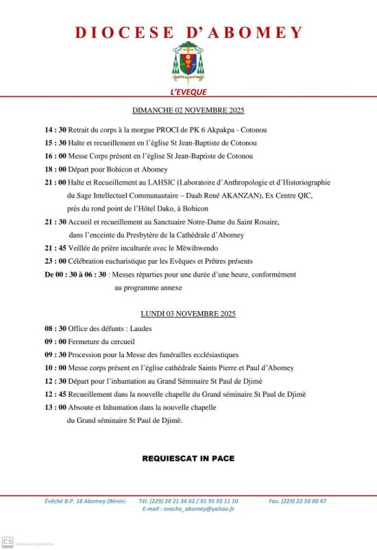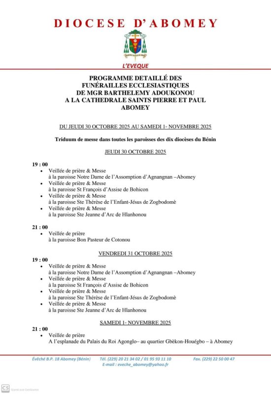 Décédé dans la nuit du 26 au 27 octobre 2025, Monseigneur Barthélémy Adoukonou sera inhumé le lundi 03 novembre prochain dans la nouvelle Chapelle au Grand Séminaire Saint Paul de Djimè, à Abomey. Ses obsèques démarrent ce jeudi 30 octobre 2025 par une série de veillées, messes, et triduums.
