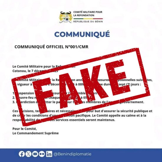 Diffusé avec un sceau officiel falsifié et le logo de la République du Bénin, le faux message portant la mention « COMMUNIQUÉ (…)
