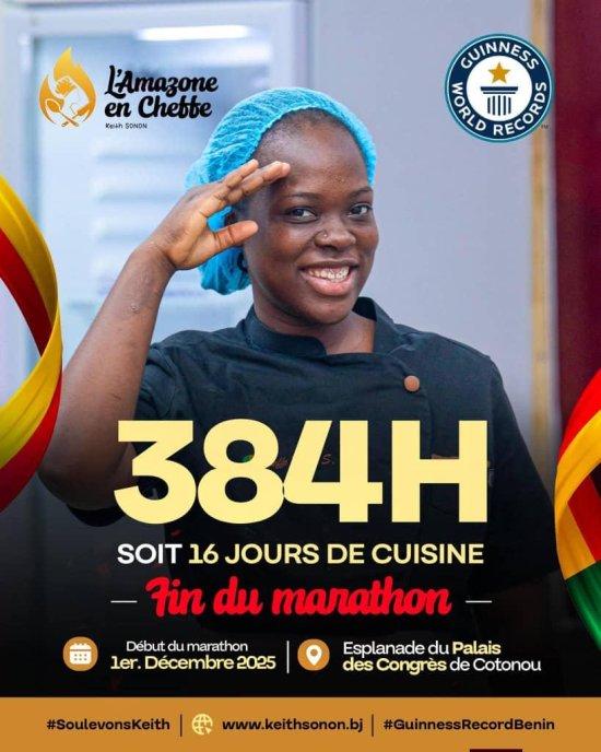 La cheffe Keith Sonon a mis un terme à son défi Guinness World Records, ce mercredi 17 décembre 2025, après 384 heures de cuisine non-stop. Engagée dans le défi Guinness World Records depuis le 1er décembre, ‘’L’Amazone en cheffe’’ a bouclé 384 heures de cuisine non-stop, soit 16 jours. Keith Sonon a mis un terme au défi ce mercredi 17 décembre 2025. ’’L’Amazone en cheffe’’ a battu le record. Il ne reste que l’étape de l’homologation officielle par le jury international du Guinness (…)