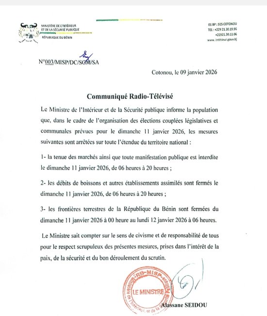 À l’approche des élections législatives et communales prévues pour le dimanche 11 janvier 2026, le ministre de l’Intérieur et de la Sécurité publique a annoncé une série de mesures exceptionnelles sur toute l’étendue du territoire national. Elles concernent notamment la suspension des activités de marchés, la fermeture des débits de boissons, l’interdiction des manifestations publiques ainsi que la fermeture temporaire des frontières terrestres, dans le but d’assurer la paix, la sécurité et le bon déroulement du scrutin.