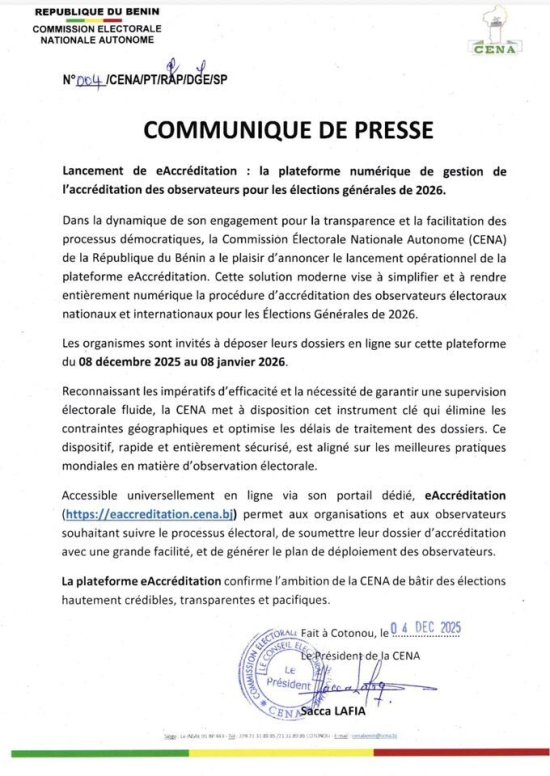Les observateurs nationaux et internationaux pourront désormais effectuer en ligne toutes leurs démarches liées à leur mission dans le cadre des élections générales de 2026. Tout se fait via https://eaccreditation.cena.bj