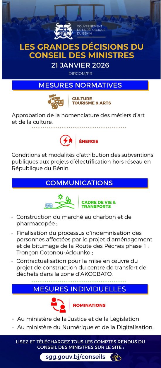 Le Conseil des ministres s’est réuni ce mercredi 21 janvier 2026, sous la présidence du Chef de l’Etat Patrice Talon. Plusieurs grandes décisions ont été prises au cours de cette séance hebdomadaire.