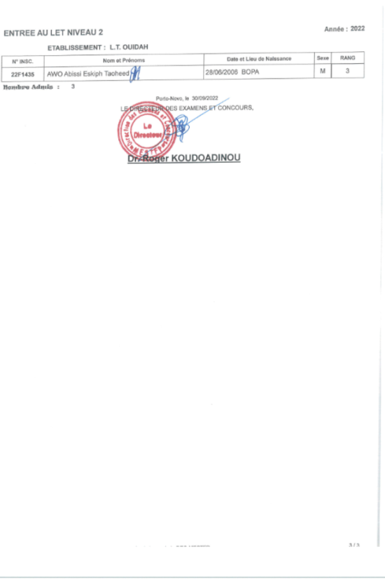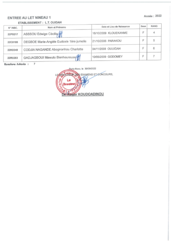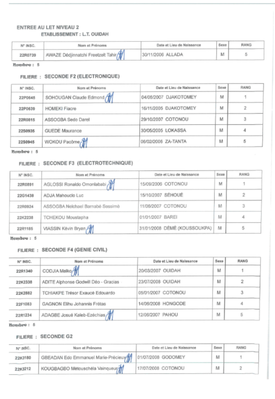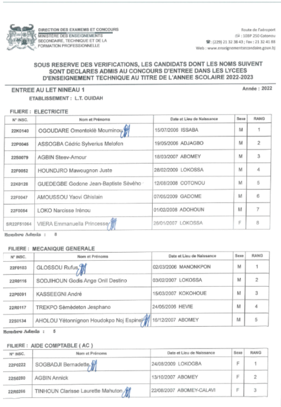 La direction des examens et concours a rendu publique la liste des candidats admis au concours d’entrée au Lycée technique de Ouidah au titre de l’année scolaire 2022-2023.