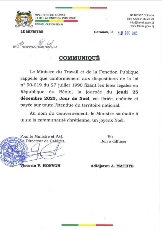 La journée du jeudi 25 décembre 2025, Jour de Noël, est fériée, chômée et payée sur toute l’étendue du territoire national. Au nom du Gouvernement, la Ministre du Travail et de la Fonction Publique souhaite à toute la communauté chrétienne, un joyeux Noël.