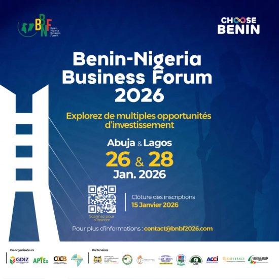 Le Benin–Nigeria Business Forum (BNBF), plateforme stratégique de rencontres, d’échanges et d’opportunités d’affaires entre le Bénin et le Nigéria aura lieu les 26 et 28 janvier 2026, dans les villes d’Abuja et de Lagos. Les inscriptions ouvertes dans le cadre de ce grand rendez-vous d’affaires entre opérateurs économiques béninois et nigérians, et acteurs économiques de la diaspora béninoise au Nigéria, se poursuivent jusqu’au jeudi 15 janvier prochain.