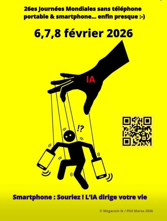 Les 26es Journées mondiales sans téléphone & smartphone se tiendront les 6, 7 et 8 février 2026. C’est un événement initié par l’écrivain français Phil Marso. Cette année, le thème : « Souriez ! L’IA dirige votre vie » met en lumière l’impact croissant de l’intelligence artificielle (IA) sur notre quotidien, interrogeant notre autonomie, nos métiers et notre sécurité.