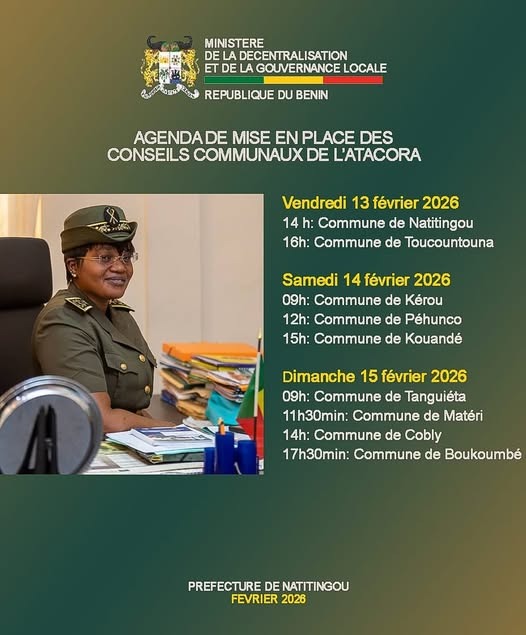 Elus au terme du scrutin du 11 janvier 2026, les conseillers communaux de la 5e mandature de la décentralisation seront installés à partir de ce vendredi 13 février 2026, dans les départements de l’Atacora et du Borgou.